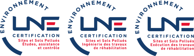 La société AMDE est certifiée dans les 3 domaines des prestations de service en sites et sols pollués (https://www.lne.fr/fr/certification/certification-sites-sols-pollues) :